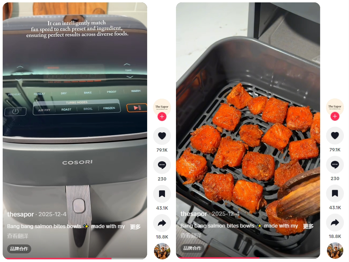 以TikTok达人@thesapor为例,在与品牌的合作视频中,没有任何冗长的口播,全程聚焦食物本身,用特写捕捉空气炸锅烹制过程中的视听效果,只在关键时刻用文字标注“6.0夸脱大容量”和“智能控温”。