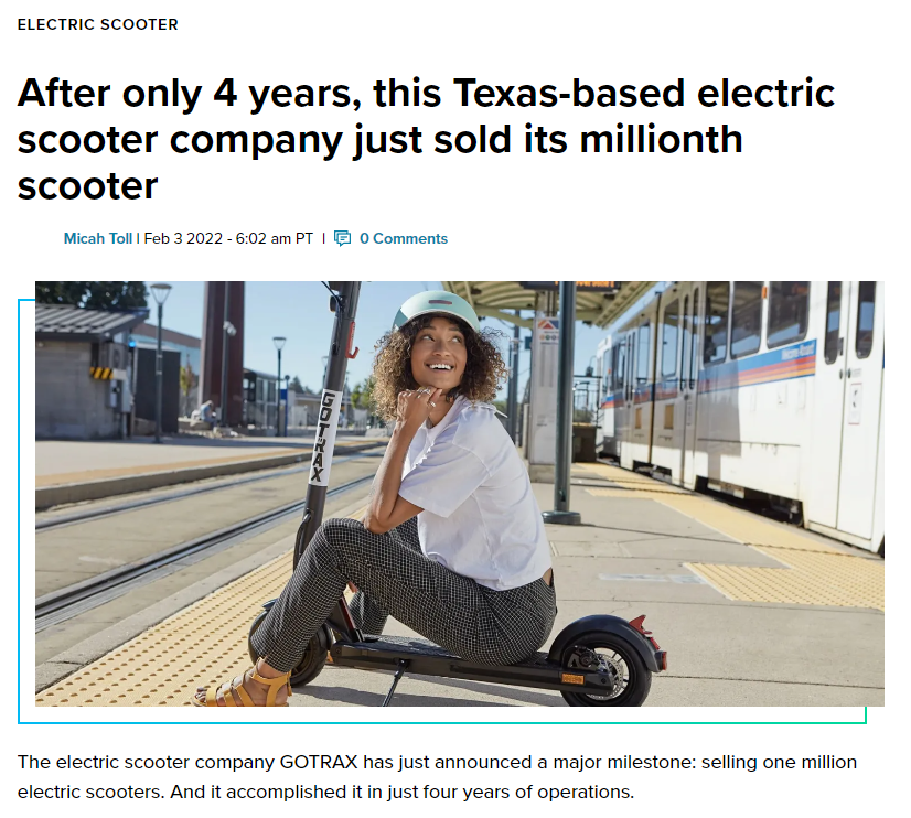 据全球权威的新能源出行媒体Electrek的报道,GOTRAX成立仅4年时间,就累计售出了100万辆电动滑板车。