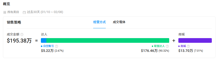 以品牌TikTok店铺Sweetcrispy S为例,其单月关联达人数量接近2170个,在店铺约195.38万美元的总成交金额中,通过达人带货实现的成交金额高达176.46万美元,占比超过90%,足以看出达人带货对品牌销量的支撑作用。