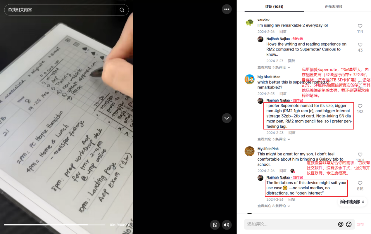 在评论区,当有用户对比Supernote与其他品牌时,达人@earghh回复到: