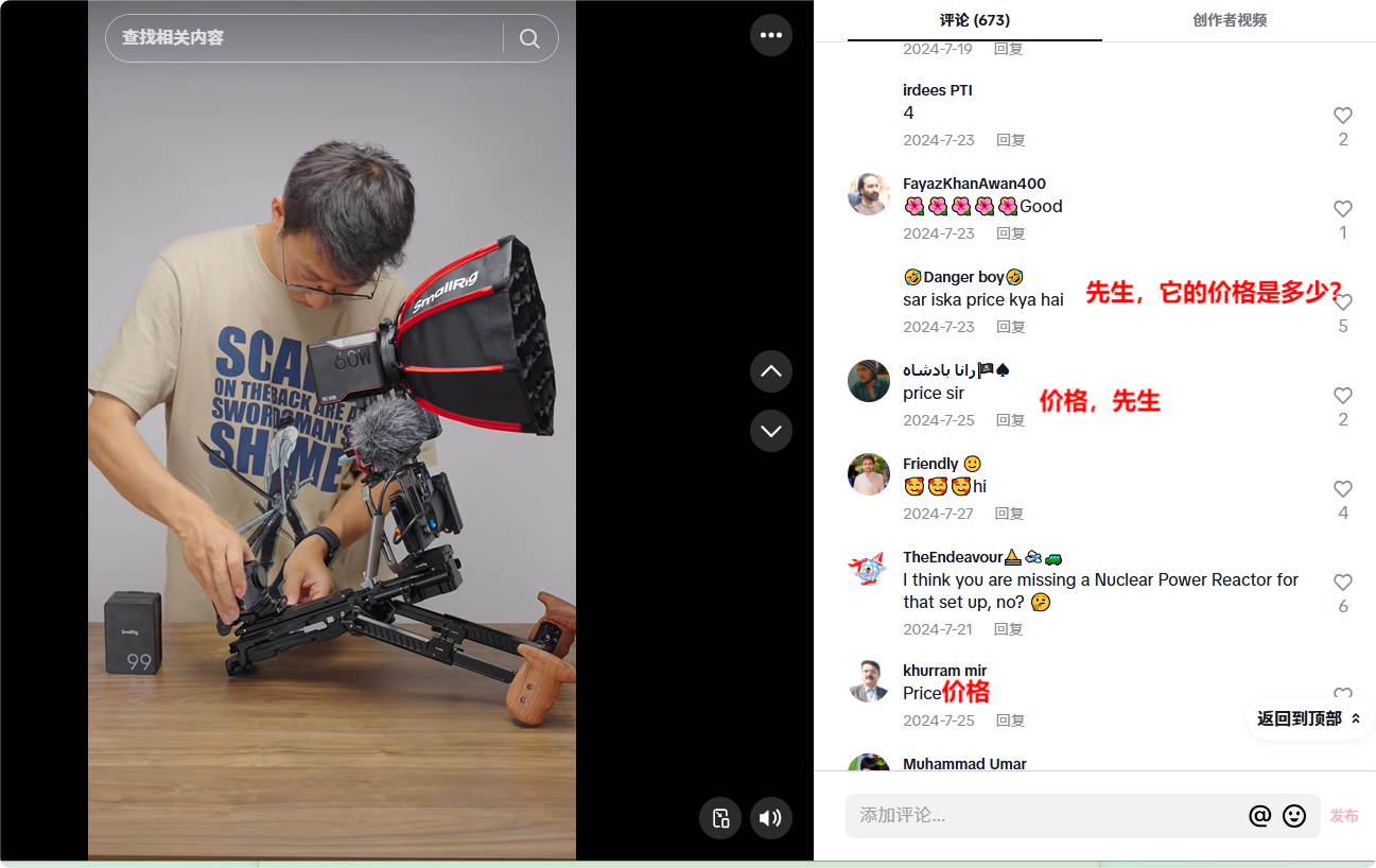 他们在TikTok上的内容以主要“摄影创作教程+产品评测+使用技巧”为主,通过真实拍摄场景展示兔笼、补光灯、稳定器等产品的使用效果。
