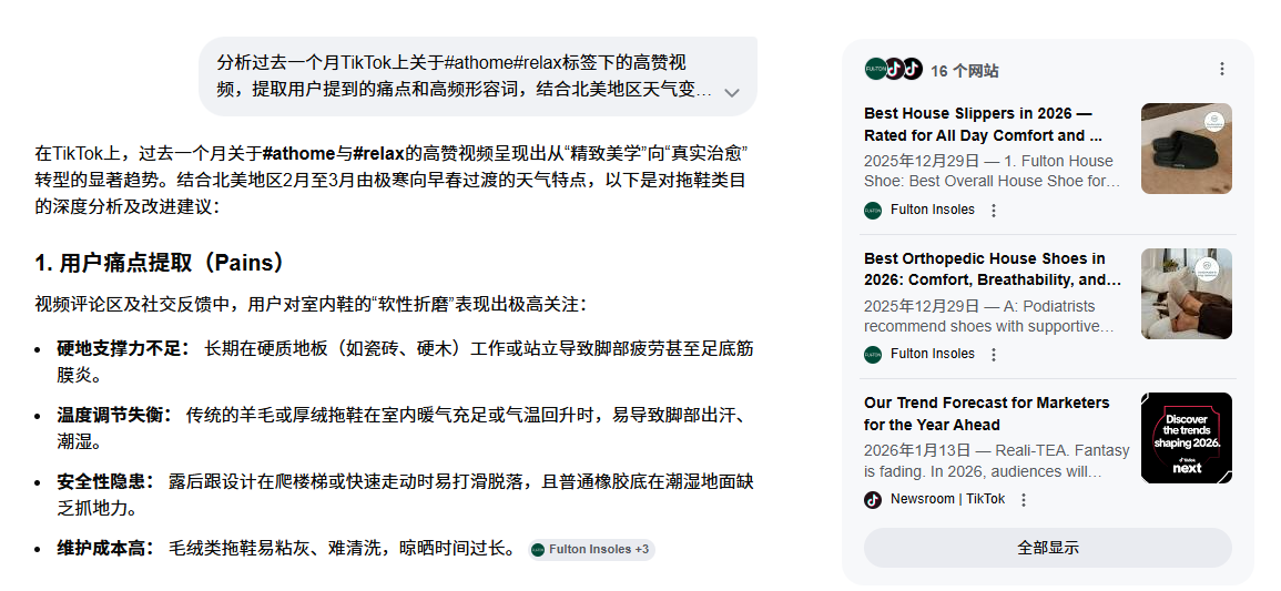 你只需要给AI指令:“分析过去一个月TikTok上关于#athome#relax标签下的高赞视频,提取用户提到的痛点和高频形容词,结合北美地区天气变化,给出拖鞋类目的改进建议。”