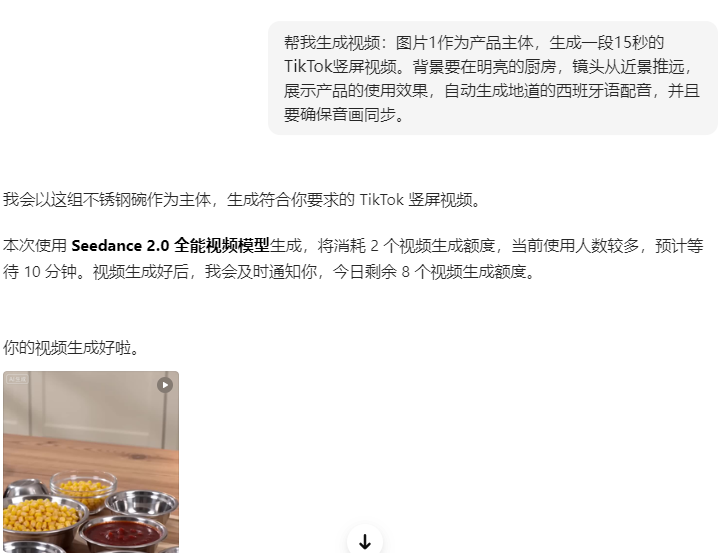 给AI的指令也很简单:“@图片1作为产品主体,生成一段15秒的TikTok竖屏视频。背景要在明亮的厨房,镜头从近景推远,展示产品的使用效果,自动生成地道的西班牙语配音,并且要确保音画同步。”