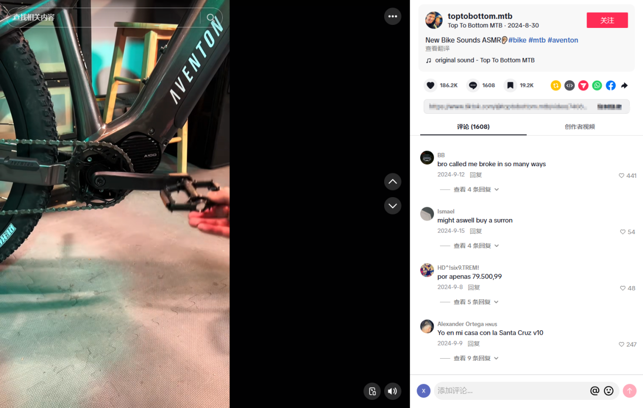 如拥有17.68万粉丝的TikTok骑行达人@toptobottom.mtb,就曾与Aventon合作,拍摄了推广产品的短视频。