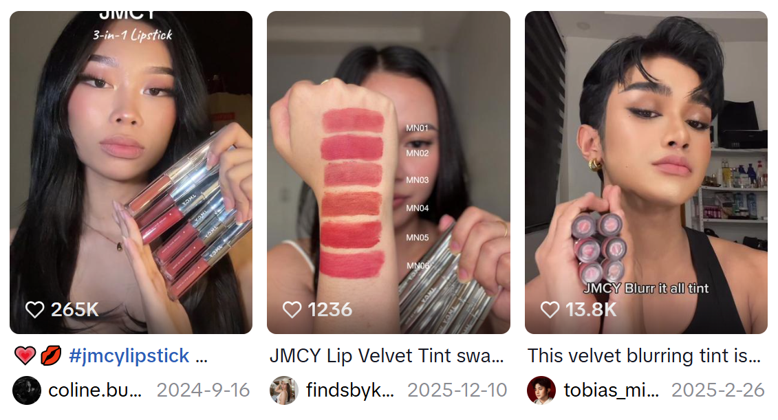 比如,其中一位仅有1.1万粉丝的达人@softstrawberrybby,通过在掌心测试JMCY三款唇釉颜色的简单视频,意外获得了2850万次播放,并带来了10万美元的销售额。