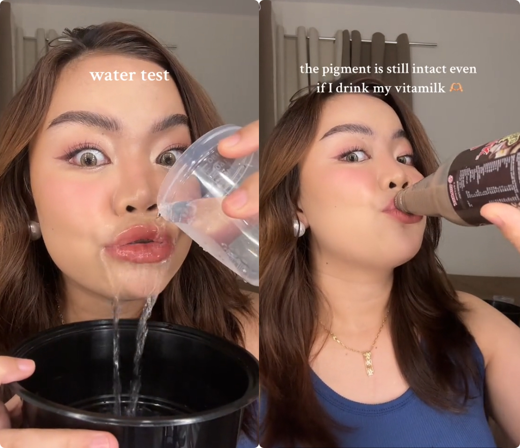 TikTok本土@airstolentino_就是很好的例子,在她发布的合作视频里,除了详细的上嘴使用讲解之外,还做了贴杯测试、冲水测试、喝瓶装饮料等一系列实测来佐证卖点。