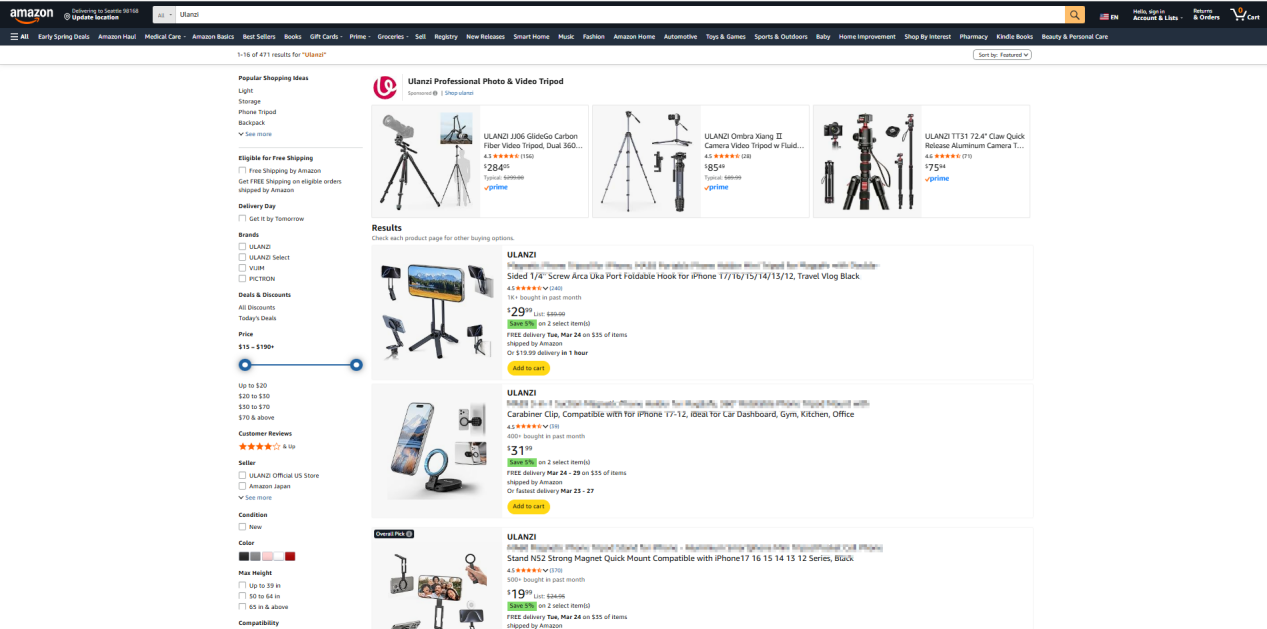亚马逊是其全球化的核心阵地,贡献了30%的海外营收。品牌深耕北美、欧洲、日本等核心站点,在摄影配件类目长期稳居TOP10。
