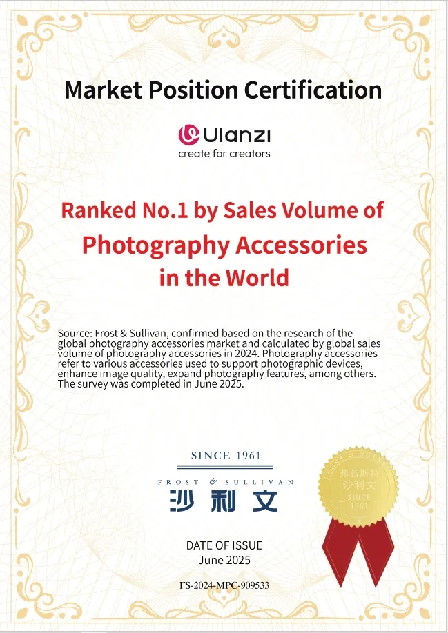 在2025年6月,国际权威机构Frost & Sullivan还发布了报告,认证Ulanzi为2024年全球摄影配件销量第一的品牌。
