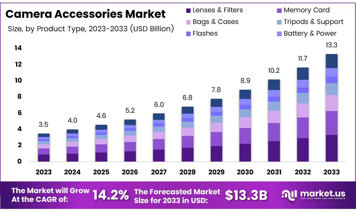 全球摄影配件的市场规模在2023年估值为35亿美元,预计到了2033年将增长至约133亿美元,预测期内的复合年增长率高达14.2%,行业发展势头十分强劲。