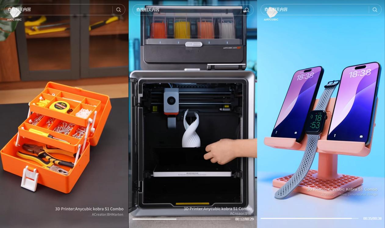 如针对家庭工具零件杂乱散落的难题,发布用自家3D打印机定制收纳盒的实操视频;或是模拟花瓶破损场景,演示手机一键连接设备、随心挑选款式快速打印坚固耐用的全新花瓶;还展示了一机多用,打造可同时收纳手机、平板与手表的多功能支架。