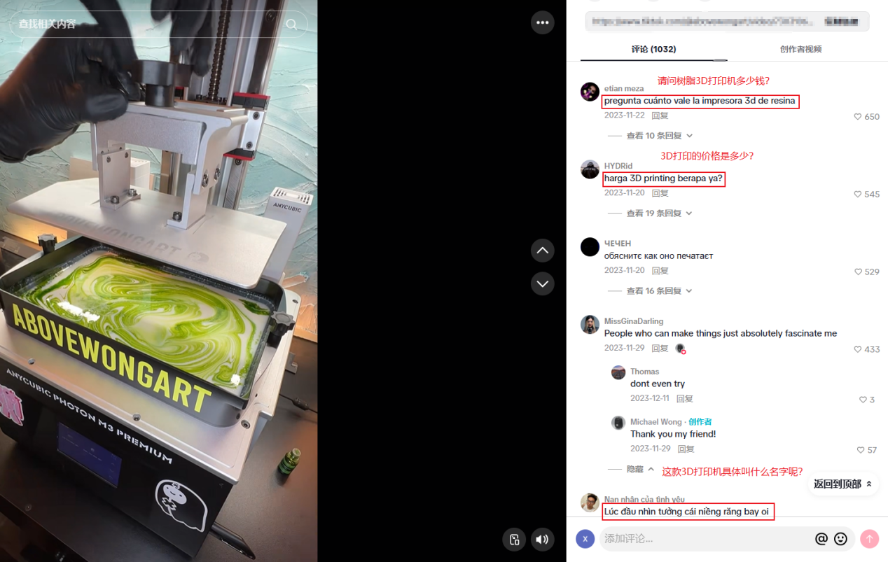 坐拥160万粉丝的3D打印爱好者@Michael Wong便是核心的合作主力,其账号内容垂直深耕3D打印赛道,与Anycubic的标签高度匹配。