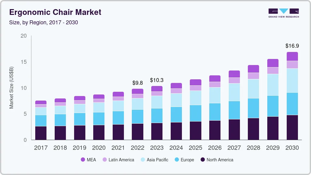 全球人体工学座椅的市场规模在2023年的估值为103亿美元,预计到2030年将有望达到169亿美元,期间几年的复合年增长率为7.0%。
