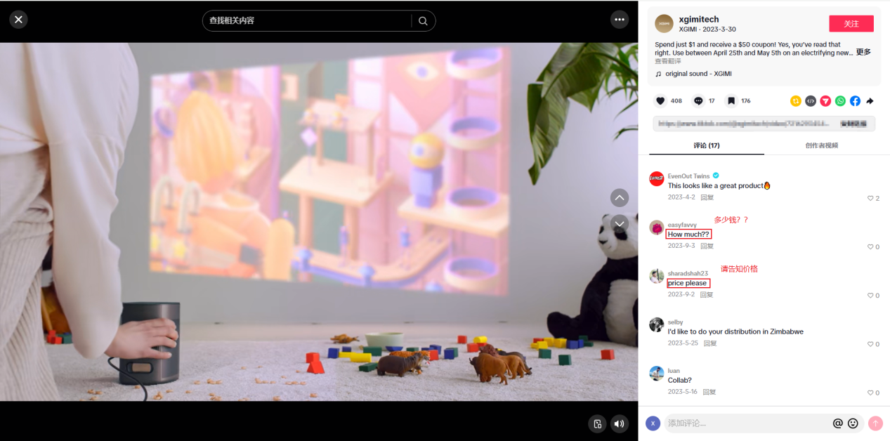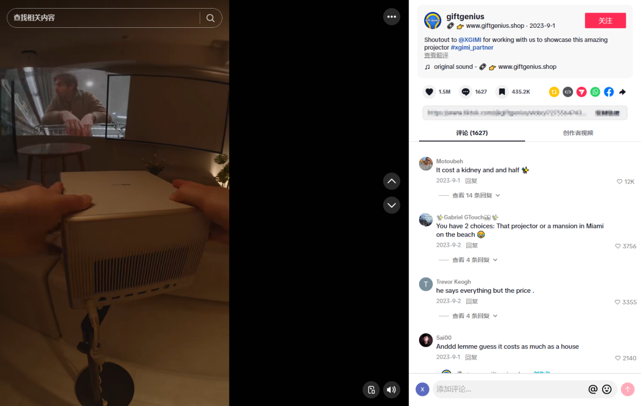 像粉丝量超220万的TikTok达人@giftgenius,就与极米品牌多次合作,产出了多条高传播爆款内容。