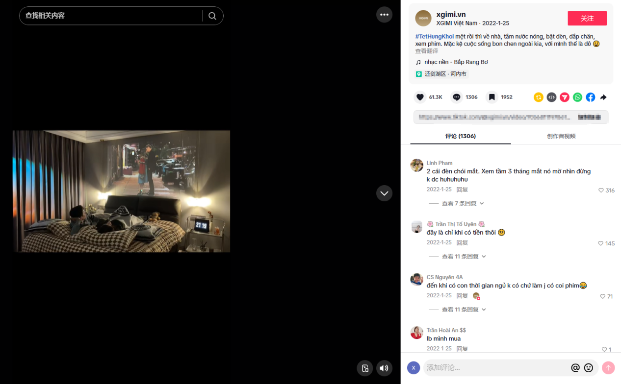以越南本土账号@XGIMI Việt Nam为例,因当地用户更偏爱慵懒舒适的居家氛围,所以账号弱化了硬核参数展示,内容紧紧围绕松弛居家、治愈观影的核心痛点打造。