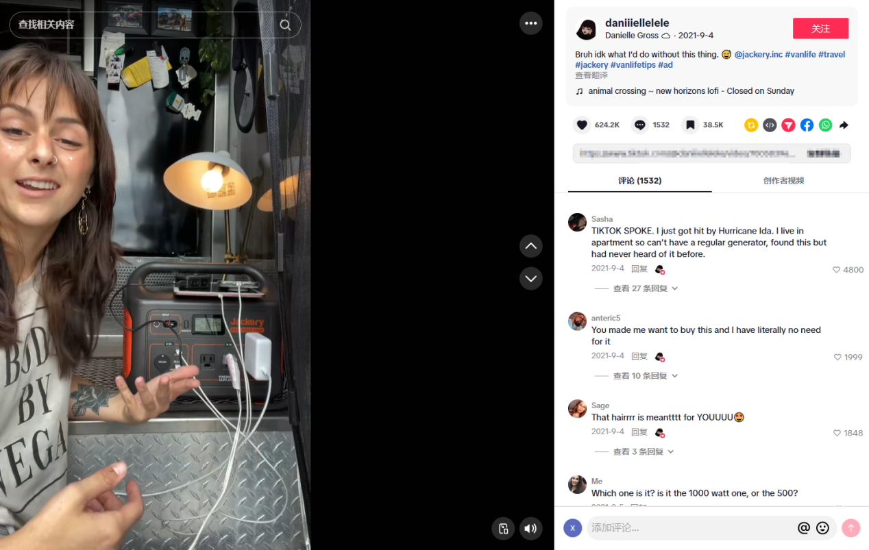 拥有29.51万粉丝的TikTok房车旅行达人@Danielle Gross,就曾为Jackery拍摄过实景种草的短片。