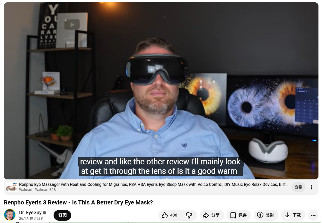 比如拥有26.1万订阅者的科技博主Dr. EyeGuy,为Renpho Eyeris 3眼部按摩仪拍摄的测评视频,从穴位按摩功能、加热功能到蓝牙无线技术进行了全方位的测试,客观展示了产品性能优势,获得了超过4.2万次的观看量。