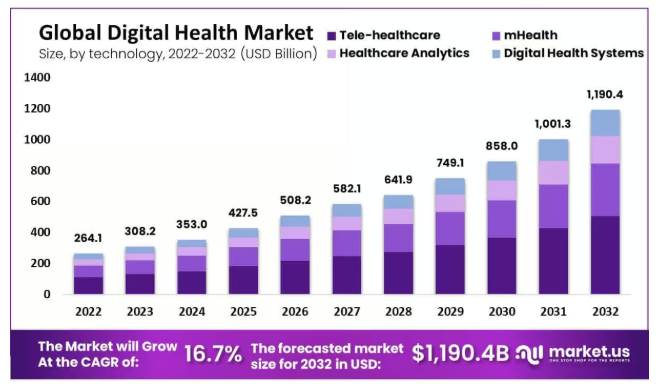 据Market.us预测,2025年至2032年全球数字健康市场规模预计将以16.7%的年均复合增长率持续增长。这意味着在未来七八年间,市场规模有望从427.5亿美元扩张至1190.4亿美元,几乎翻三倍。