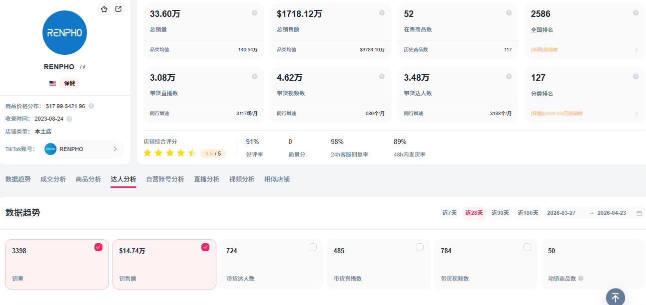 从Renpho的TikTok店铺后台数据来看,累计总销量已达149.54万件,总销售额突破1718万美元,参与带货的达人超过3.48万人,产出了4.62万条视频内容,月均直播场次也稳定在3100场以上。