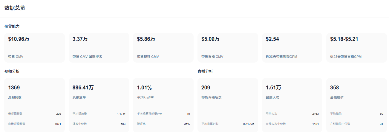 据第三方数据平台显示,品牌近28天内进行了209场带货直播,累计直播GMV达到5.09万美元,直播GPM维持在5.18-5.21美元区间。平均每场直播时长超过2.5小时,在线人次中位数约1484人,体现了品牌对直播渠道的持续投入和精细化运营。