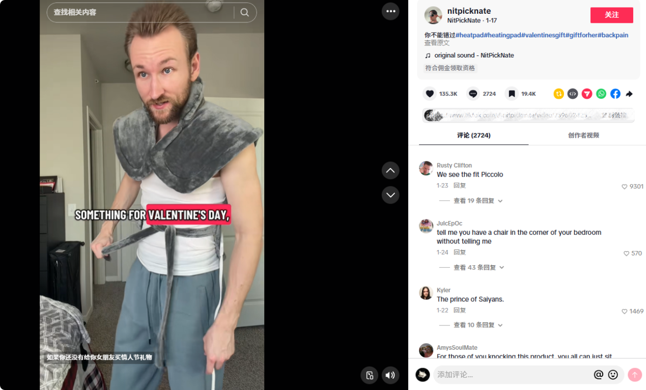 比如,拥有4.21万粉丝的TikTok达人@nitpicknate为Renpho的背部加热毯拍摄了一条体验视频,内容没有任何花哨的剪辑,就是对毯子的使用和整体细节进行了详细的讲解。