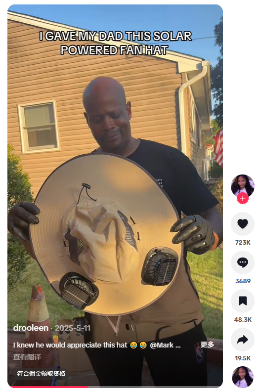 这款帽子是怎么火起来的?一位美国博主给正在户外烧烤的父亲送了这顶帽子,父亲戴上后满脸惊喜,视频收获了70多万点赞、3000多条评论。随后销量直接起飞,开年就有经销商预订10万个,5月跻身爆款行列,6月达到峰值。在TikTok Shop上,类似的夏季风扇帽上线28天就狂揽320万人民币的销售额。