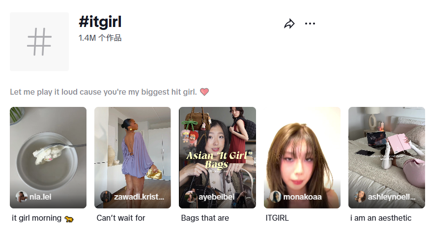 另一个值得关注的趋势是都市精致生活。#itgirl、#dayinmylife这些标签的播放量在TikTok上动辄几百亿,夏季热度更是持续走高。