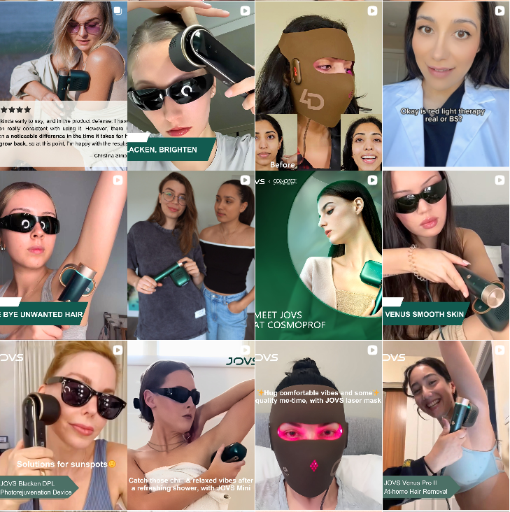 JOVS品牌在TikTok上主要以达人合作为核心的营销方式,携手美妆、个护赛道的垂直达人,通过实拍产品的使用教程与脱毛实测内容,让潜在用户看到产品真实的使用过程和效果,从而有效打消购买疑虑。
