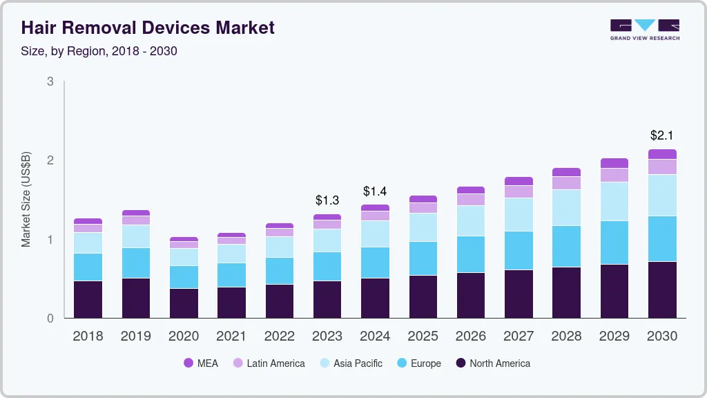据Grand View Research发布的研究数据,在2023年,全球脱毛设备市场的规模估值为13亿美元,预计到2030年将有望增长至21亿美元,期间6年的复合年增长率达到了7.2%,发展潜力十足。