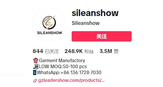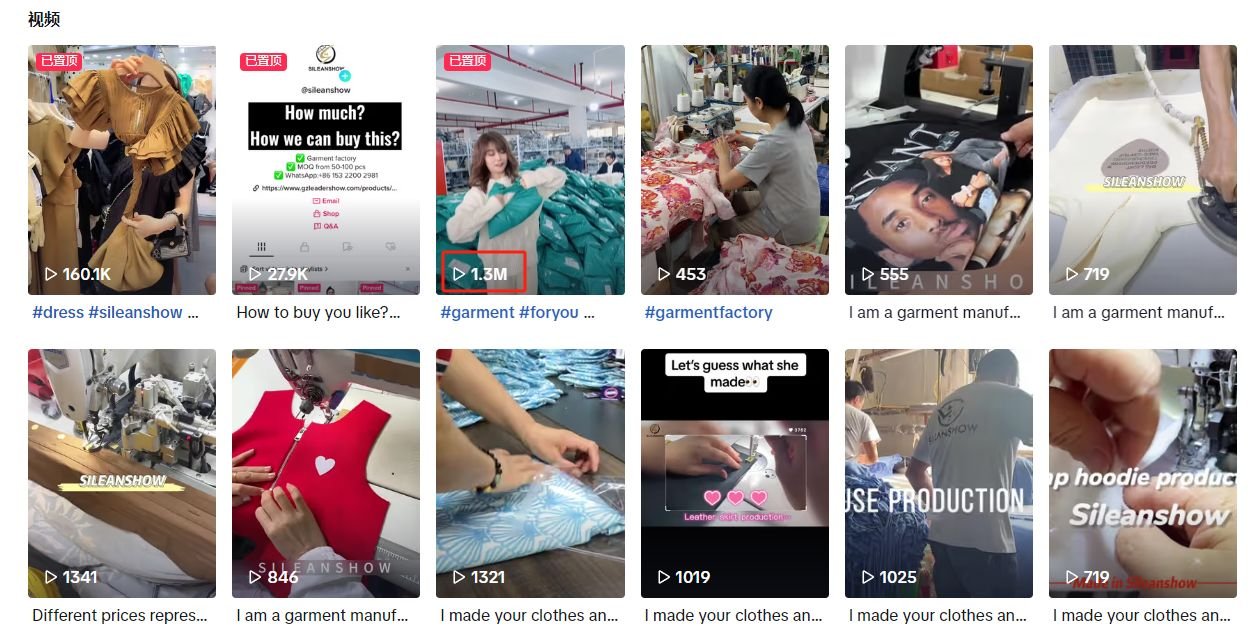 鑫翎秀服装工厂品牌并不满足于国内市场,所以在TikTok上创建了自己的海外账号@slieanshow,通过发布视频的方式吸引客户,获取询盘。目前来看,Ta的海外账号做得不错。