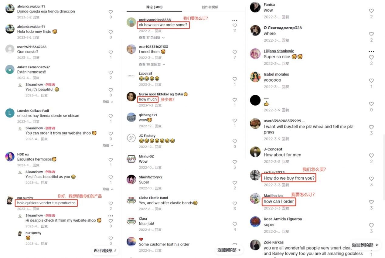 鑫翎秀服装工厂品牌的TikTok账号视频数据,除了上面提到的爆款视频外,平均保持在几千播放,表现并没有特别的抢眼。但仅凭借几千的播放数据,其TikTok账号@slieanshow就收获了大量的询盘,许多客户评论区留言询问怎么订?多少钱?可见Ta账号的转化能力!