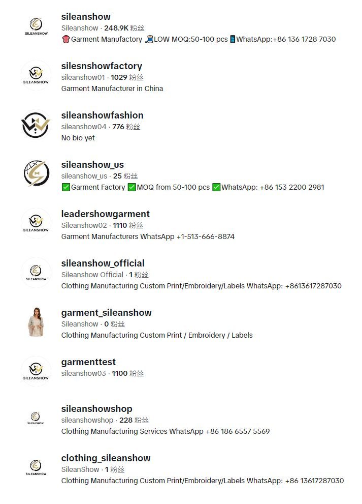 经过整理,兔克发现鑫翎秀服装工厂品牌通过在TikTok上设置多个账号的方式,构建了自己的庞大账号矩阵,从而获得了较单一账号更好的流量曝光,详情请看下图。