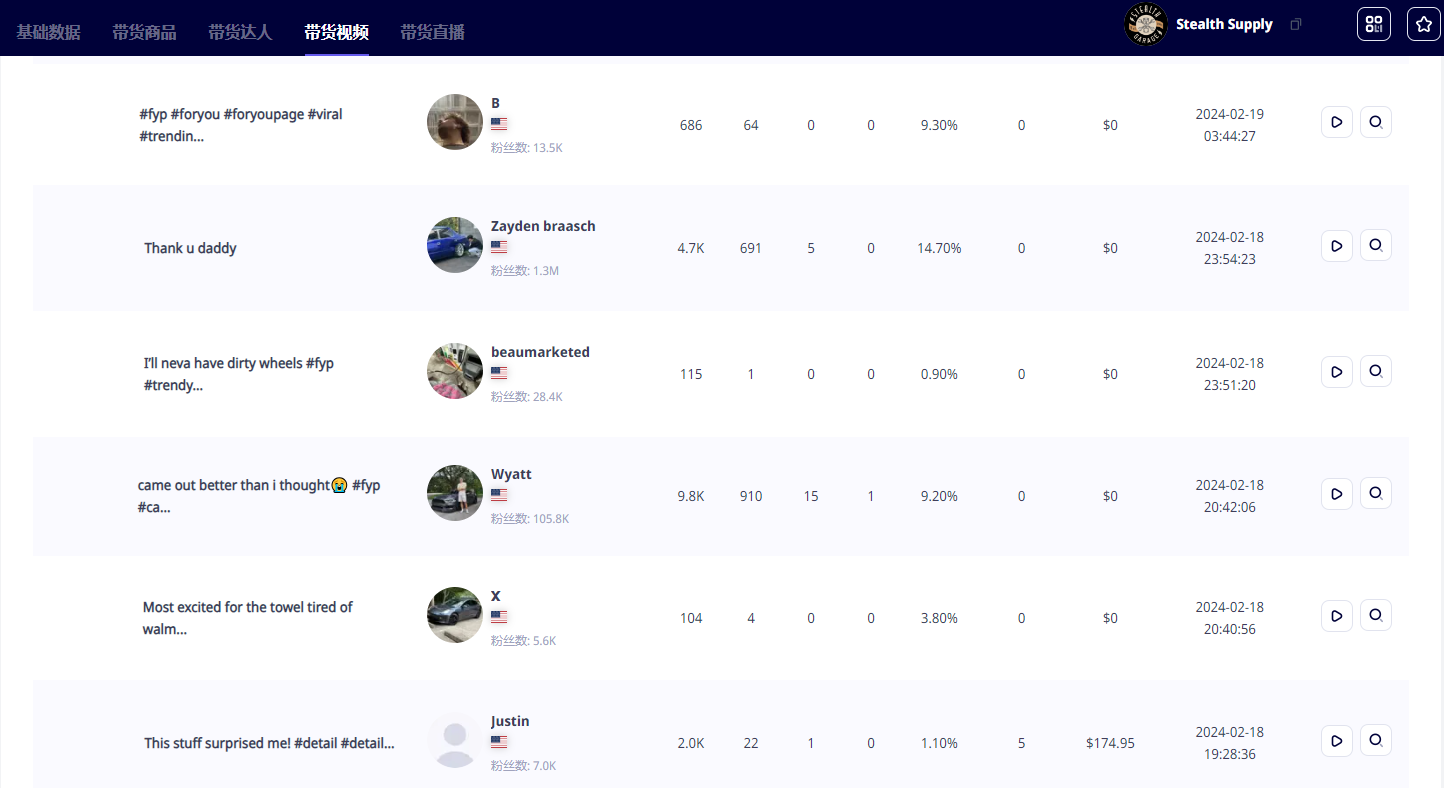 Stealth Supply小店的合作达人及视频 图源:EchoTik