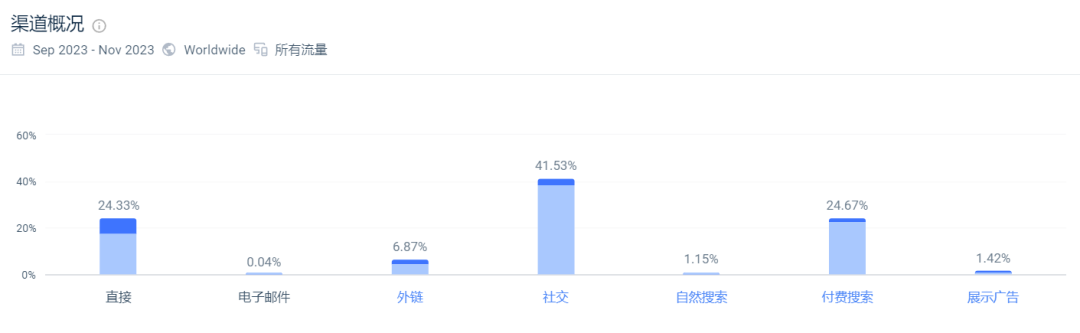 从独立站的流量构成来看,社交流量占据了相当大的比重,高达41.53%。这一数据充分证明了Totwoo在社交媒体运营方面的策略是行之有效的,成功吸引了大量用户通过社交平台访问其网站。