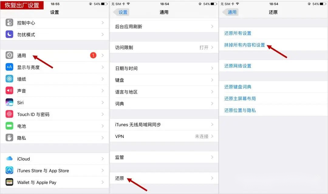 操作路径:设置-通用-还原-抹掉所有内容与设置