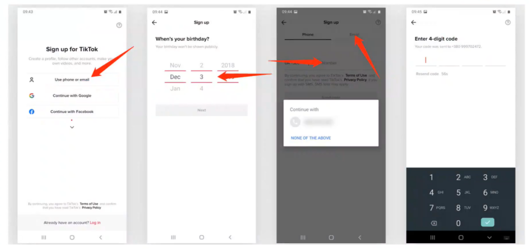 注意:使用新的Gmail账号其他邮箱账号注册TikTok要慎重,尽量选择自己可控账号注册,因为存在新号注册TikTok后收不到验证码的问题。