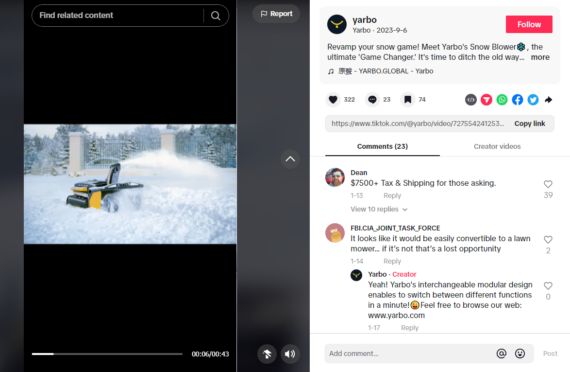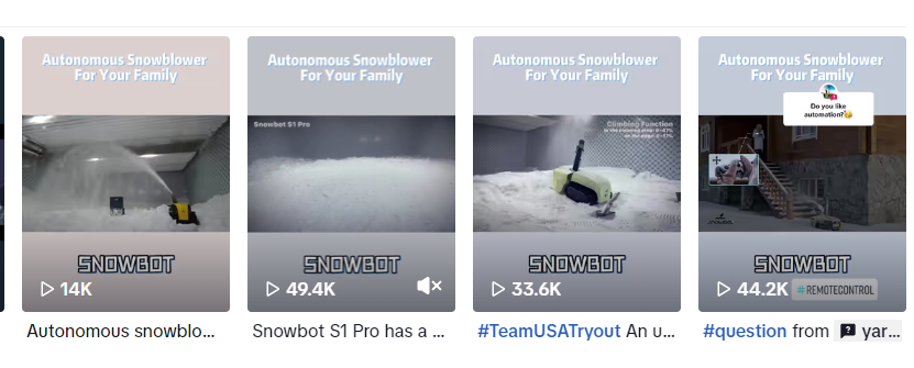 Yarbo早在它还是Snowbot时期就已进入TikTok的开始发布视频,尽管更新频率并不高,但在一定时间后均取得了不错的播放量,也为主页挂载的独立站带来了大量的流量。