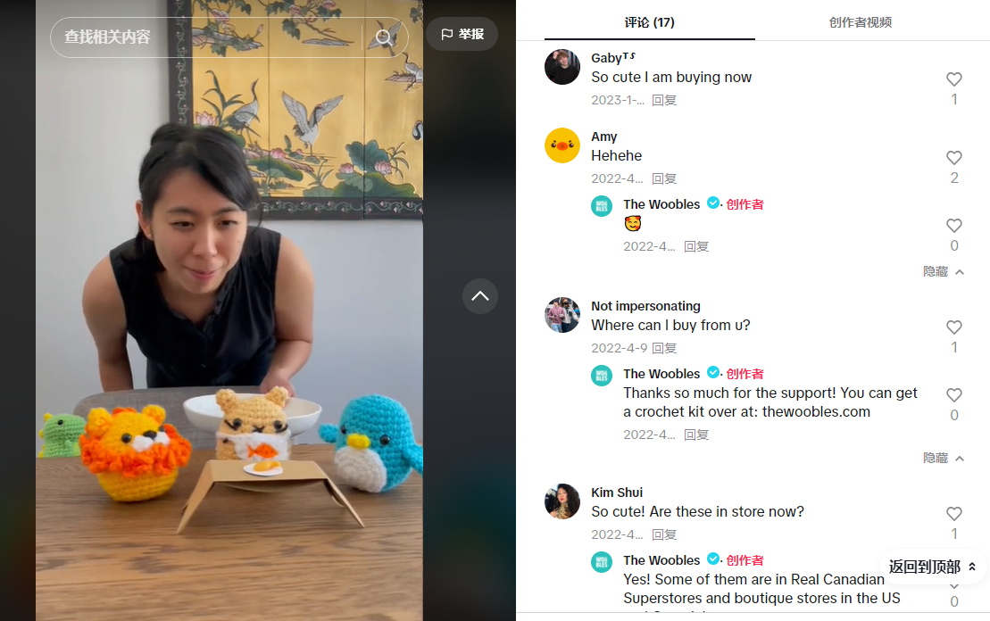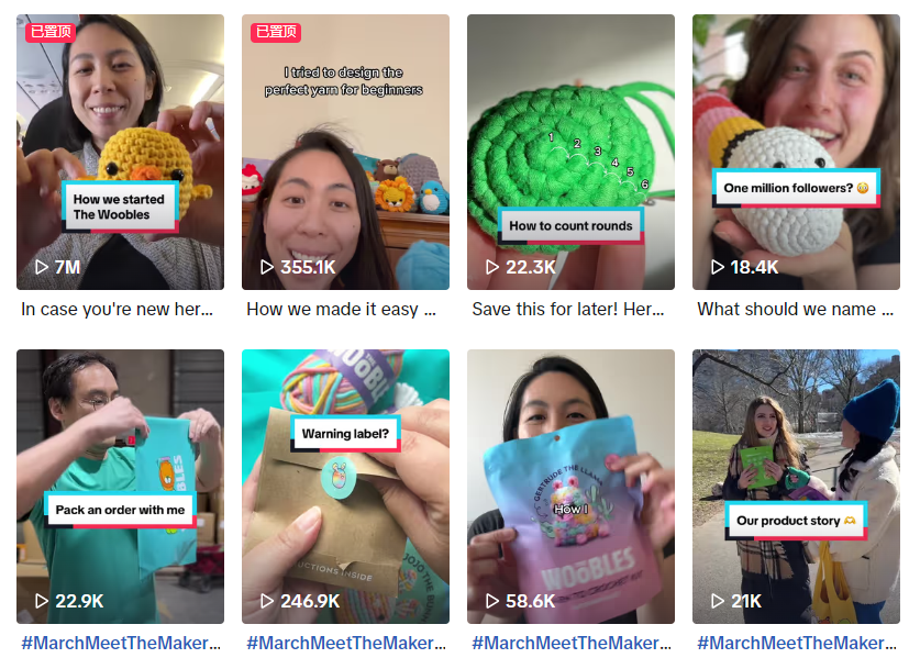 之后The Woobles乘胜追击,将重心放到了TikTok上,接连发布了一系列钩针编织教学视频和产品开箱,收获了大量的观看和点赞。