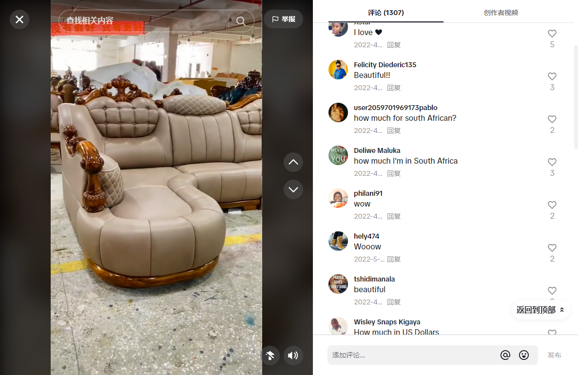 比如TikTok上一个名叫@yhomebaby的账号,就是国内做家具跨境出海的。它的视频很简单,大多都是工厂里的沙发产品,或者商场里展厅布景,却能收获33.7万的粉丝。在播放量飙升的同时,也收到了大量的询盘。你还能说它做B2B获客难么?
