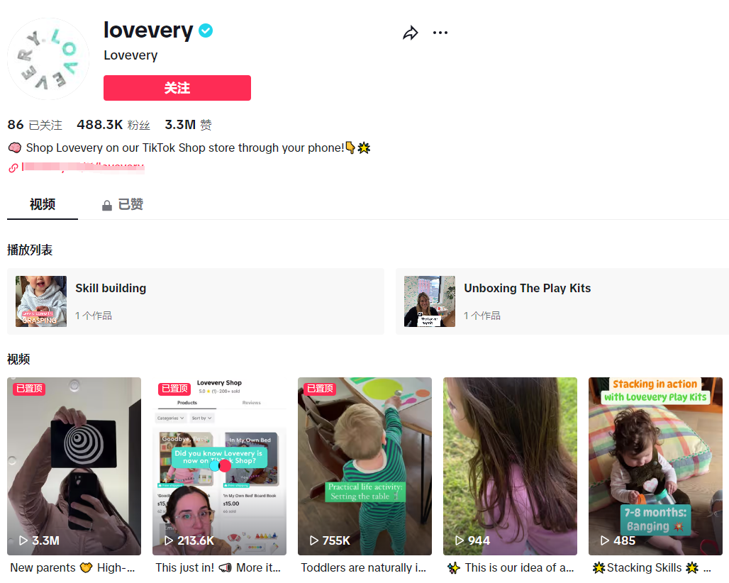 近几年,它还进驻了TikTok等全球社交媒体平台,通过持续更新产品使用视频,来吸引更多的客户。截至发稿前,Lovevery在TikTok上的主要账号已经积累了48.83万的粉丝,收获点赞超330万。