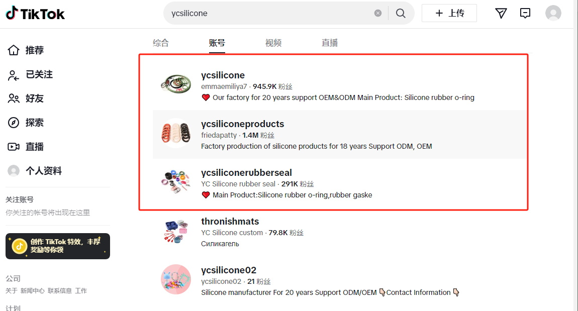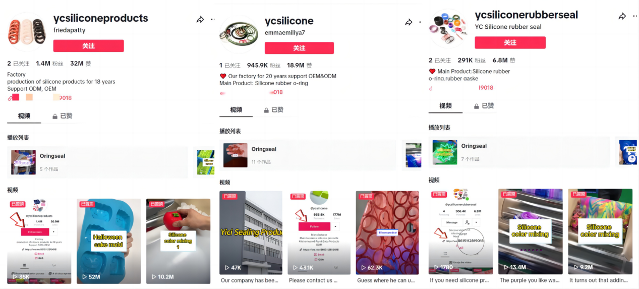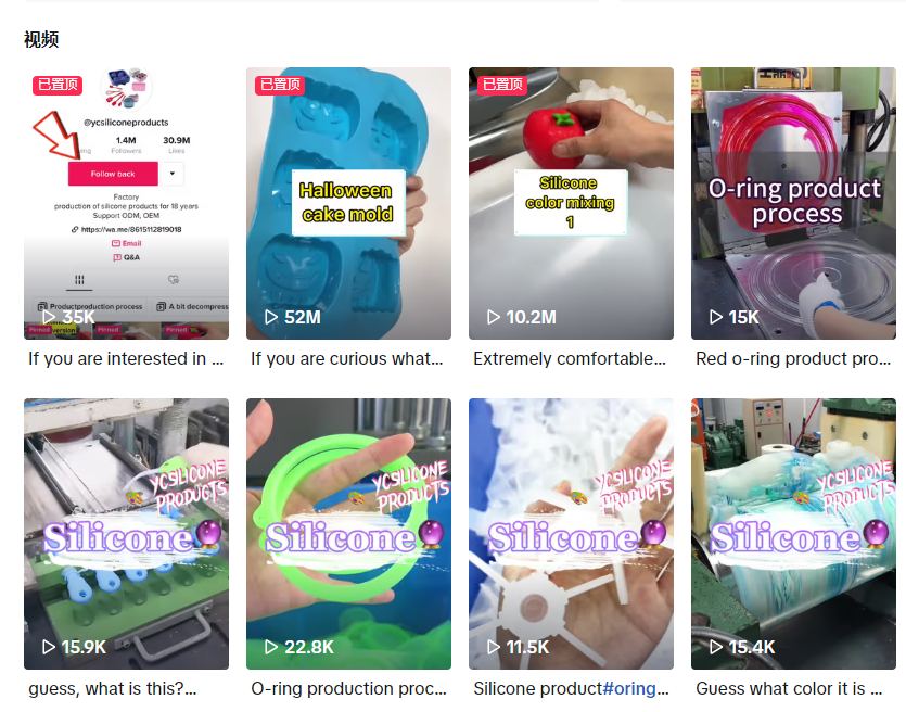 以账号@ycsilicone为例,它是广东益驰密封制品有限公司的账号,该公司主做硅胶O形圈、异形件等等,是传统的B2B类型工厂。