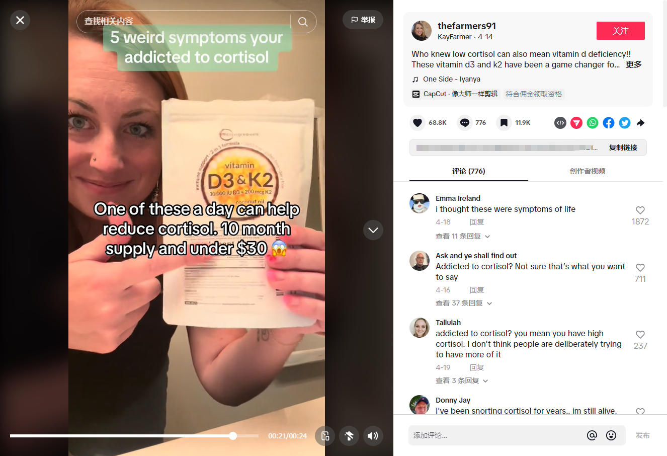 这款产品之所以走红,是因为一位博主@thefarmers,在视频中生动描述了自己日常生活中的不适,并宣称通过服用这款维他命补充剂,这些症状得到了显著改善。视频发布后,迅速获得了超过160万的播放量和近3万的点赞。