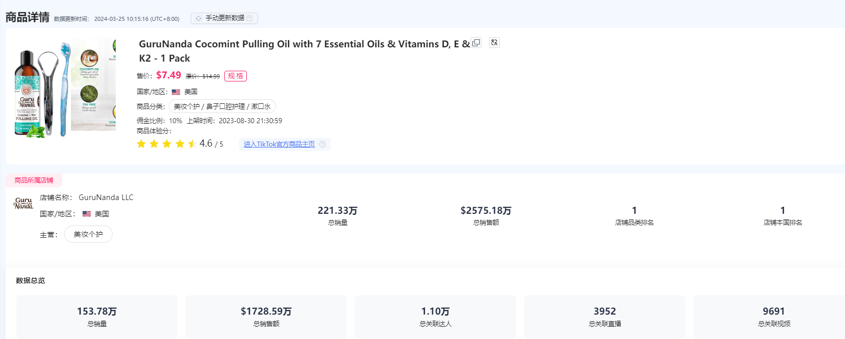 比如GuruNanda漱口水。它于2023年9月初在TikTok shop上架。凭借达人们的推广,这款产品在短时间内迅速积累了人气。到2023年底,一段介绍该产品的视频播放量突破千万,获得了数万点赞和数千次分享,使得GuruNanda在TikTok美国小店的销量榜中名列前茅。