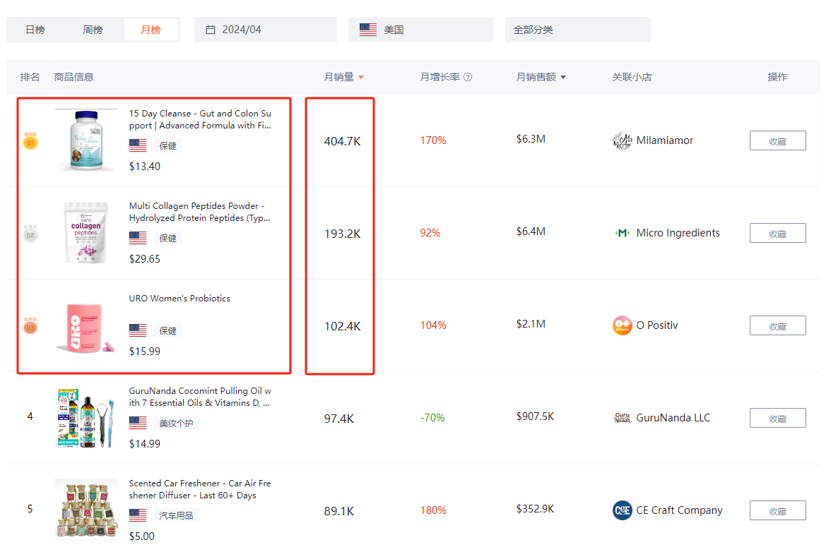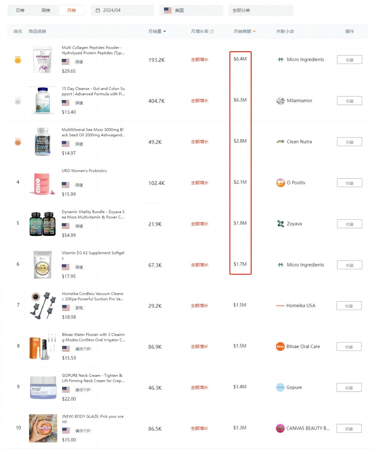 以上排名是从销量来看,如果从月销售额来看,大家会更加地惊讶发现,4月TikTok美区小店月榜Top10,竟然有6款全部是保健品,且牢牢占据了前六位置。