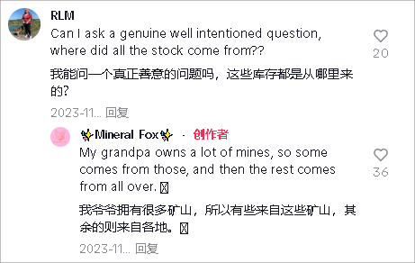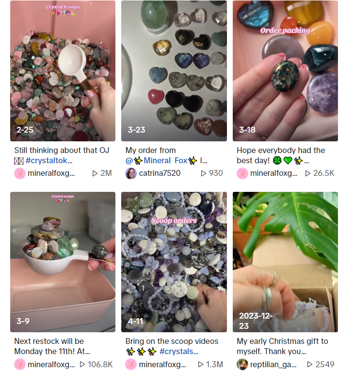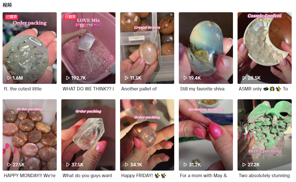 在TikTok上,@mineralfoxgems账号每周发布4-5条视频,内容包括产品打包、水晶细节展示、水晶饰品制作、寻找水晶资源的幕后故事等。视频浏览量从几万到几百万不等。