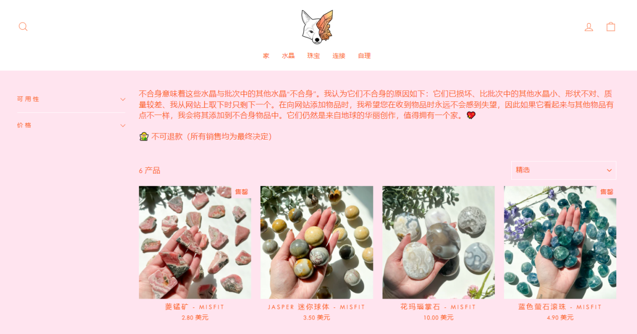 值得一提的是,Mineral Fox在网站上设立了“瑕疵品”专区,将质量稍差的产品以较低价格售卖,既减少了成本支出,也增加了其他商品的说服力。而且Kaliesha通过视频解释这些瑕疵品的来源和特征,让消费者明白这些瑕疵对产品本身的能量和功能没有影响,从而获得更多购买意愿。