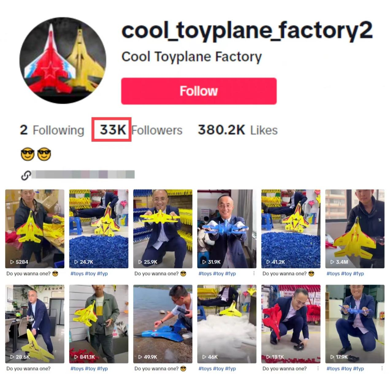 成立于2011年的浙江志扬实业有限公司,是一家集品牌经营、设计研发、批量生产、市场营销于一体的玩具制造企业,主营儿童航模玩具,扎根国内市场的同时,也将目光瞄准了海外,TikTok正是其重要的营销阵地。得益于有效的经营,目前其TikTok粉丝数3.3万。