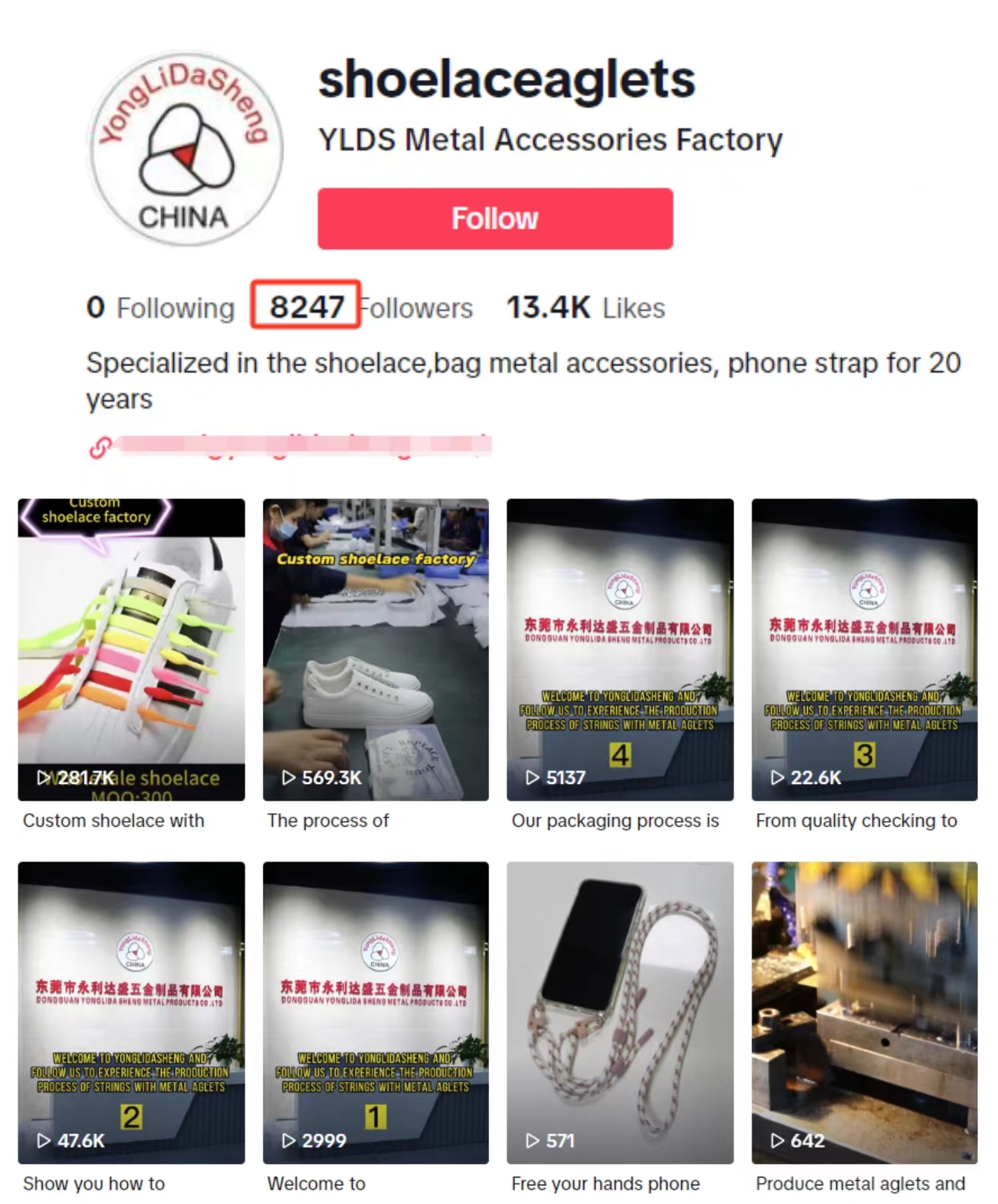事实上,这件事永利达盛五金制品有限公司做到了。通过发布视频,其TikTok账号目前粉丝数8247,小有成就。