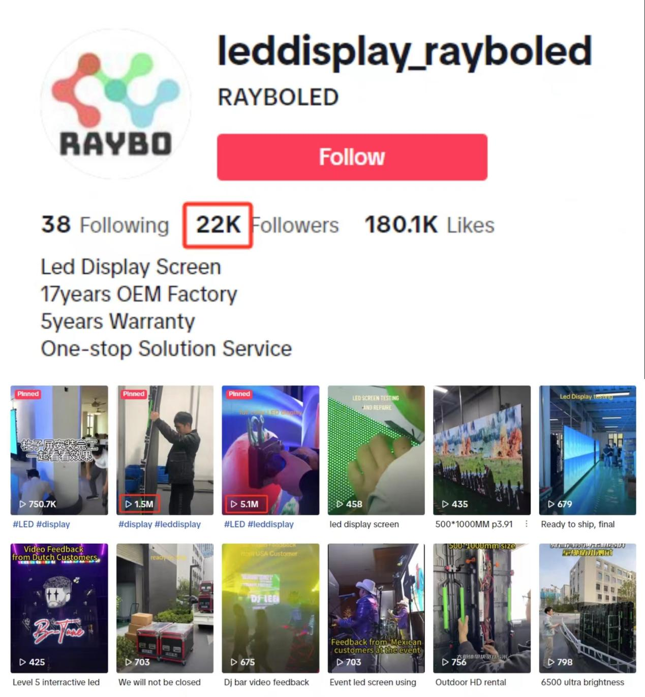 深圳市瑞波LED显示屏制造有限公司,是一家主营户外LED显示屏、透明LED屏幕、地砖屏幕、创意设计LED屏幕制造的企业,其生产的产品除了在国内销售外,同样在海外市场销售。而TikTok便是其主要营销阵地,通过布局TikTok,也取得了喜人的成绩。目前其TikTok账号粉丝数2.2万。