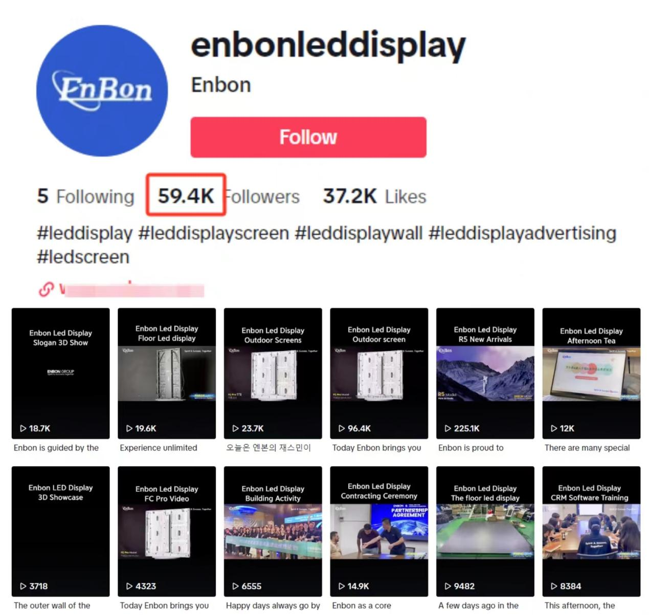 成立于2012年2月的深圳英宝光电有限公司,集研发、生产和销售于一体,是室内外节能显示屏的领先生产商之一,能够为国内外的高端客户群体提供专业的OEM/ODM服务。在海外宣传时,其也将目光瞄准了TikTok,而经过努力,目前其TikTok账号粉丝数为5.94万。