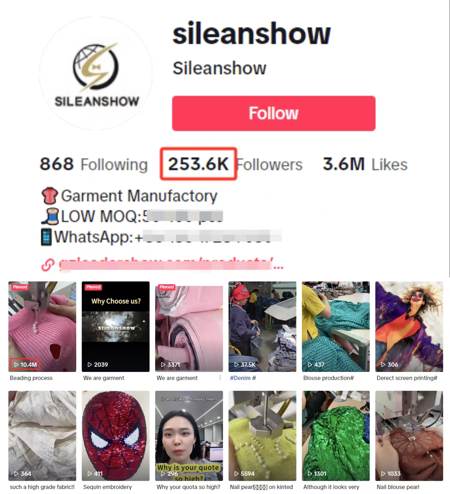 广州鑫翎秀服装有限公司,是一家集开发和生产各种针织和梭织面料的对外贸易公司,专业生产时尚服装。除了在国内市场深耕外,该公司也开通了海外社媒账号,TikTok便在其中。而通过精心的运营,目前其TikTok粉丝数为25.36万,收获了大量询盘。